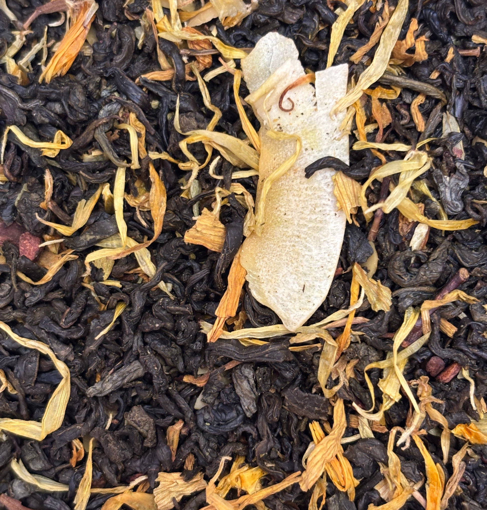 Té verde Chun Mee, almendra, canela, pétalos de girasol, flor de caléndula, coco, aromas naturales.